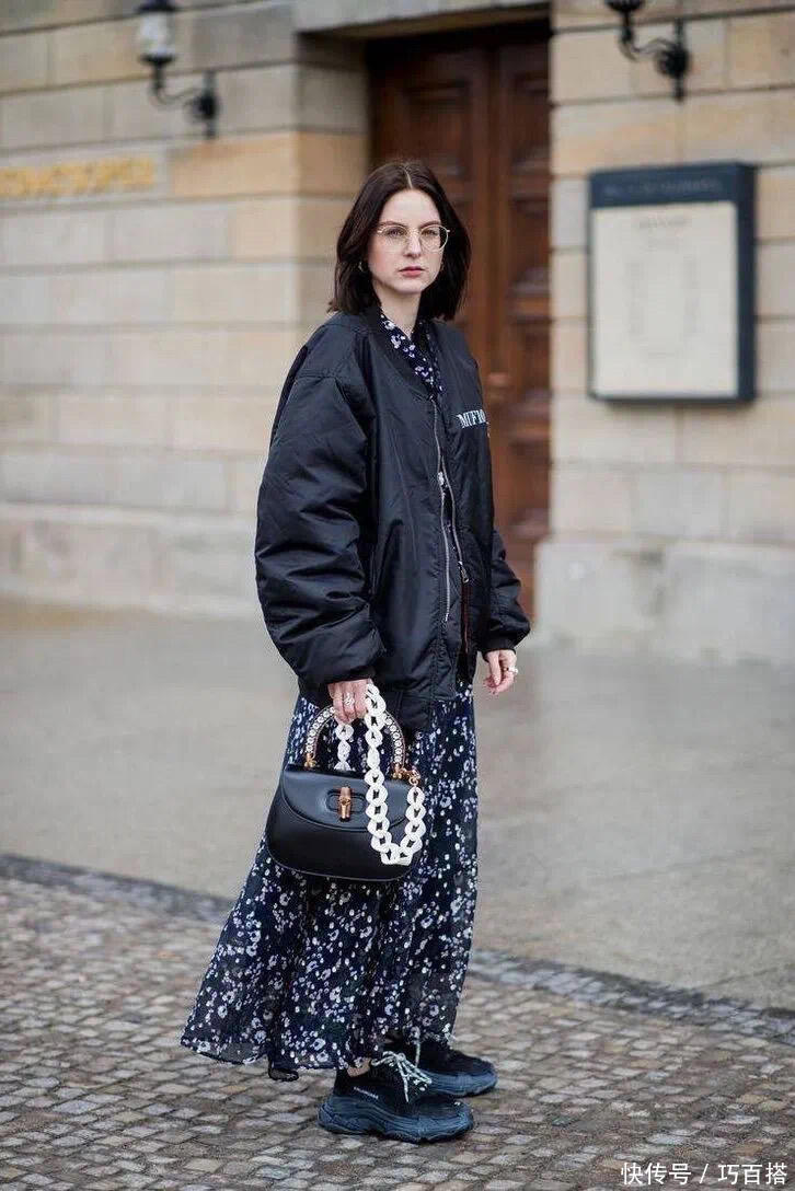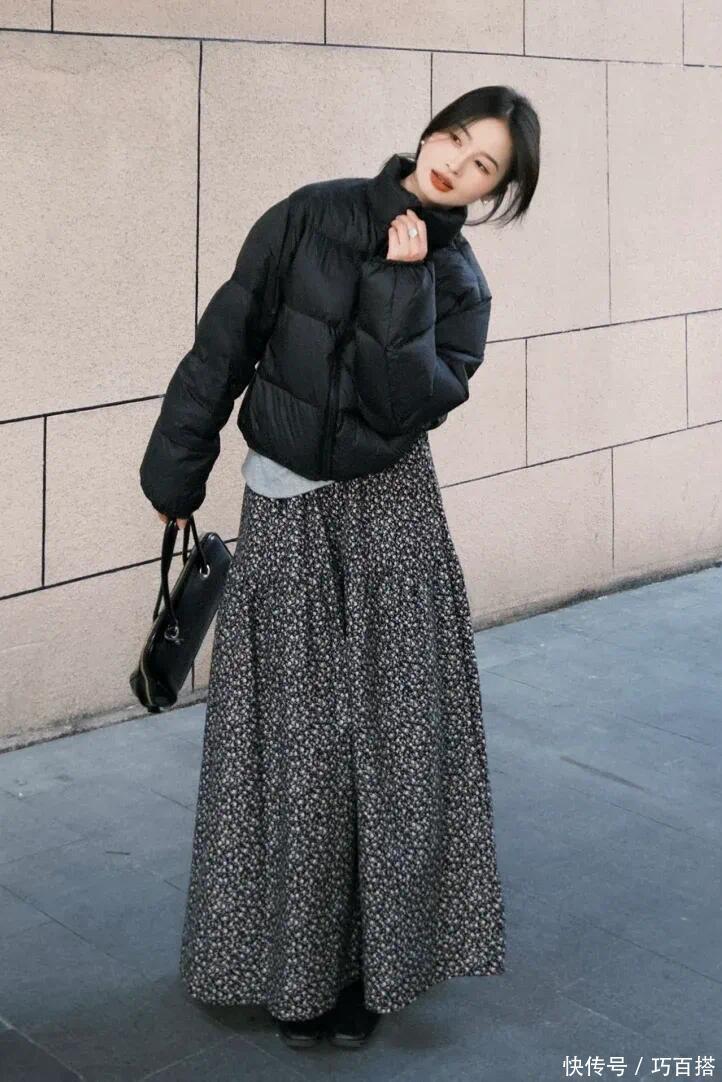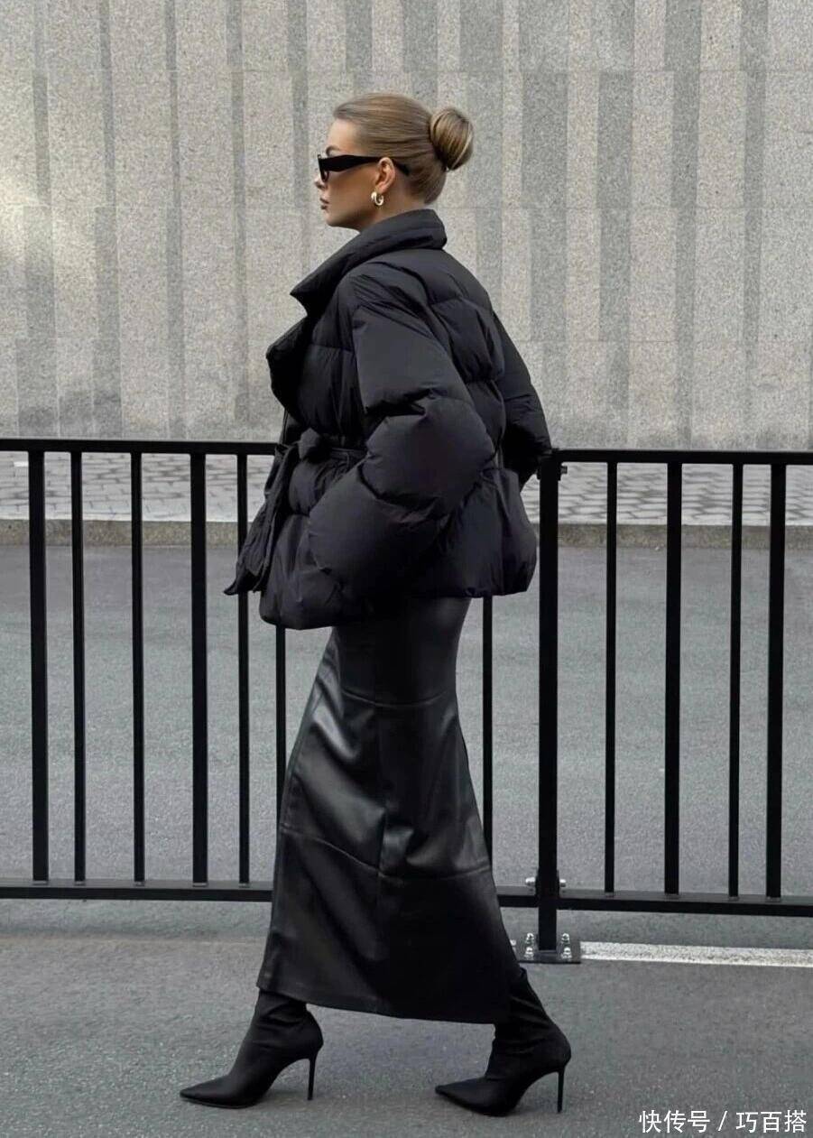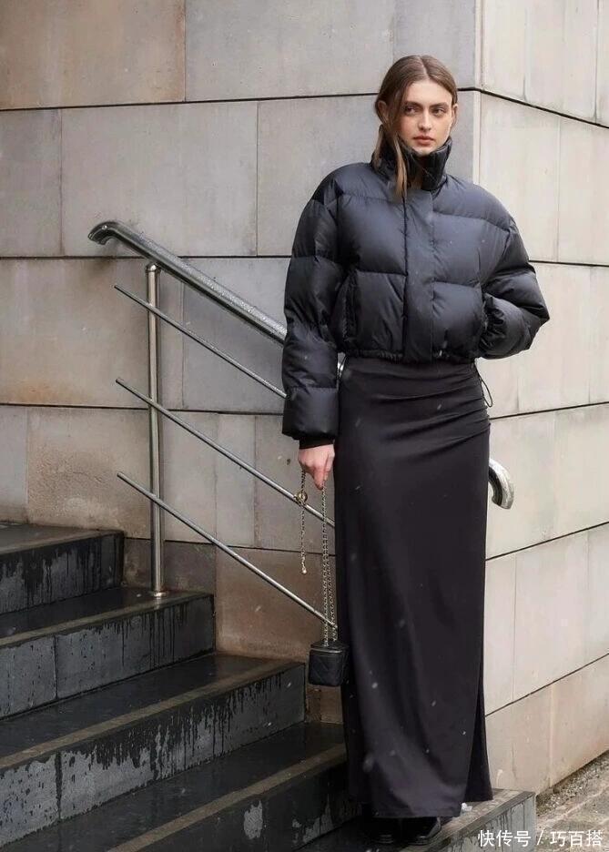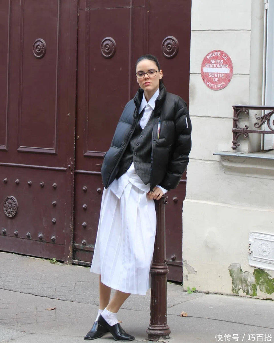 这种情况下,紧身包臀裙、鱼尾裙就需要避开了,以直筒裙、百褶裙与黑色羽绒服搭配,视觉上更统一。