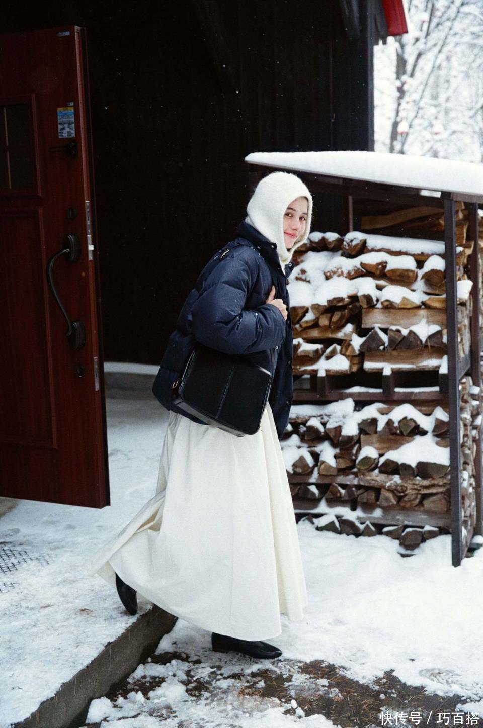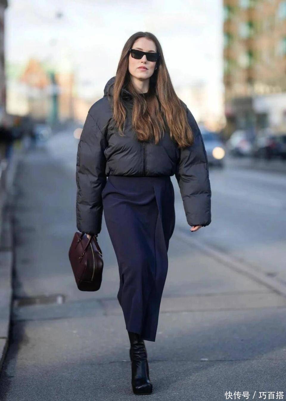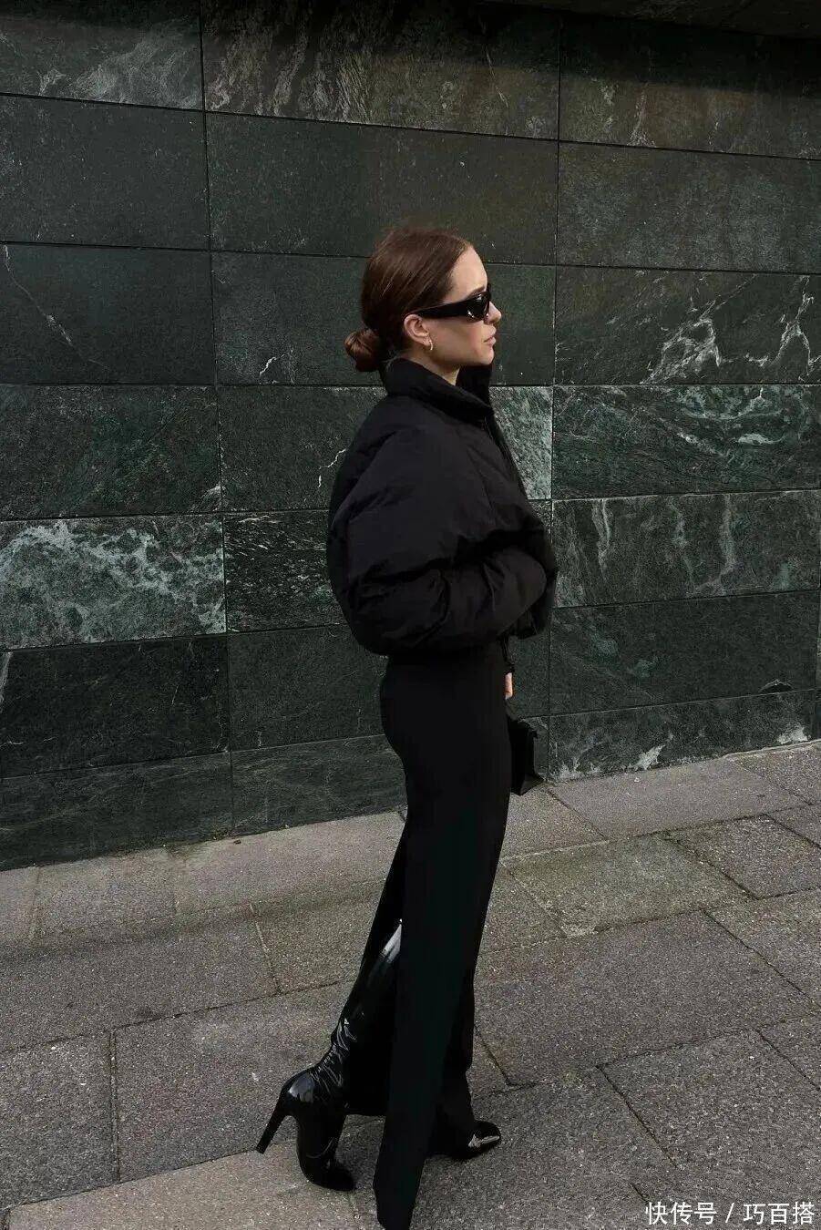 最后,太过紧身的半裙也不推荐大家选择,一是因为非常考验身材和腿型,要求过于苛刻,二是不能添加保暖单品,影响保暖锁温效果,三是会让上下身比例失调,蓬松黑色羽绒服与之搭配视觉上非常不匀称。