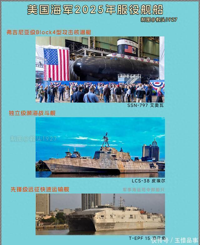2025年4月5日,康涅狄格州格罗顿潜艇基地,美国海军第24艘弗吉尼亚级核攻击潜艇爱荷华号(USSIowa,SSN-797)举行服役仪式。半年后的11月16日独立级濒海战斗舰皮埃尔号(USSPierre,LCS-38)在佛罗里达州巴拿马城完成服役。 整整一年,美国海军就这么2艘新舰正式入列,如果非要多算,还有一艘海运司令部的快速运输舰,但这玩意严格来说不属于军舰。 对比中国海军2025年接收的超过23万吨新舰——1艘8万吨航母、1艘4万吨两攻、7艘驱逐舰、2艘护卫舰,这成绩单实在拿不出手。更尴尬的是,这仅有的两艘里,濒海战斗舰还是个被美国海军自己都嫌弃的废物。
